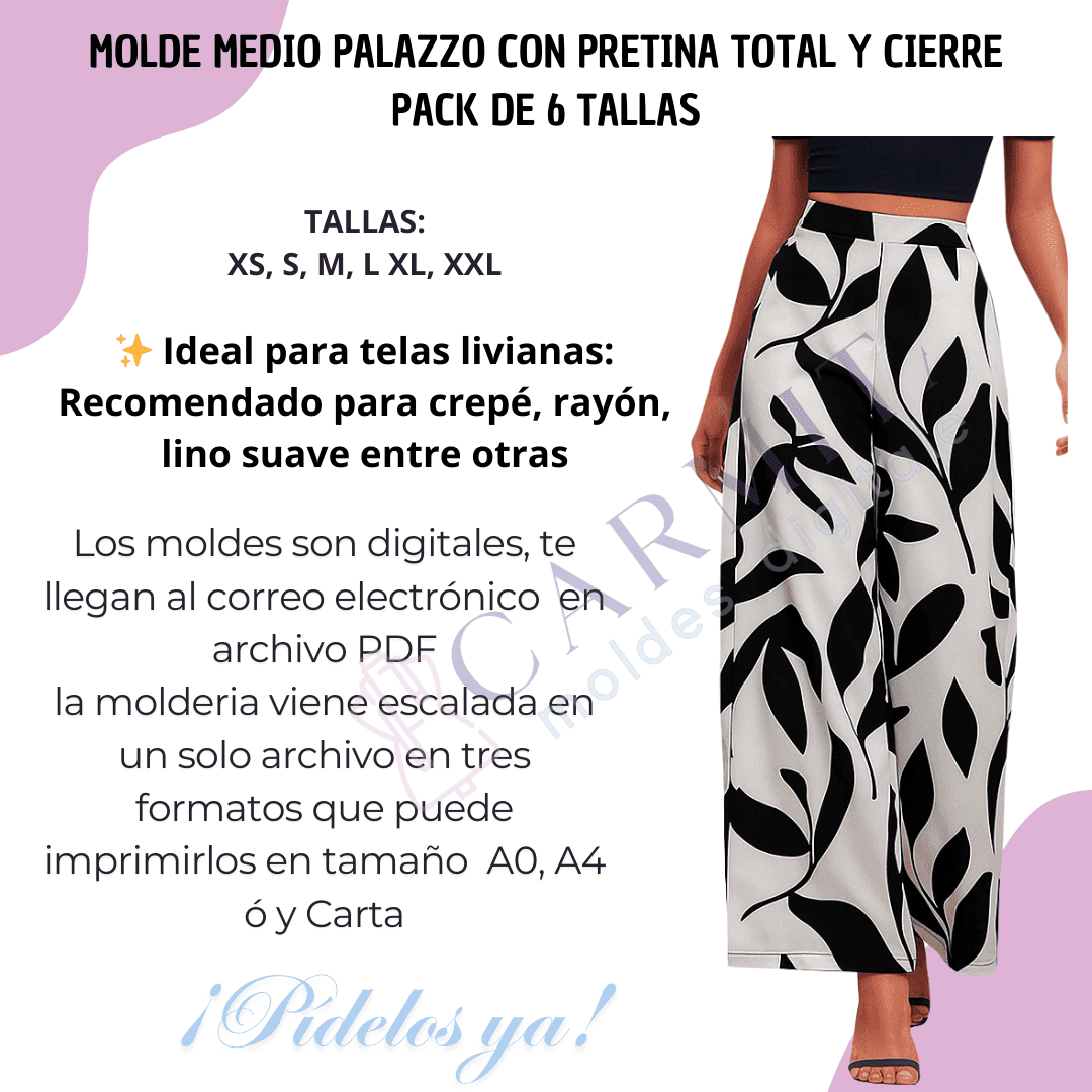 | Molde digital | medio palazzo con pretina y cierre, Carmita moldes digitales. PDF. |
