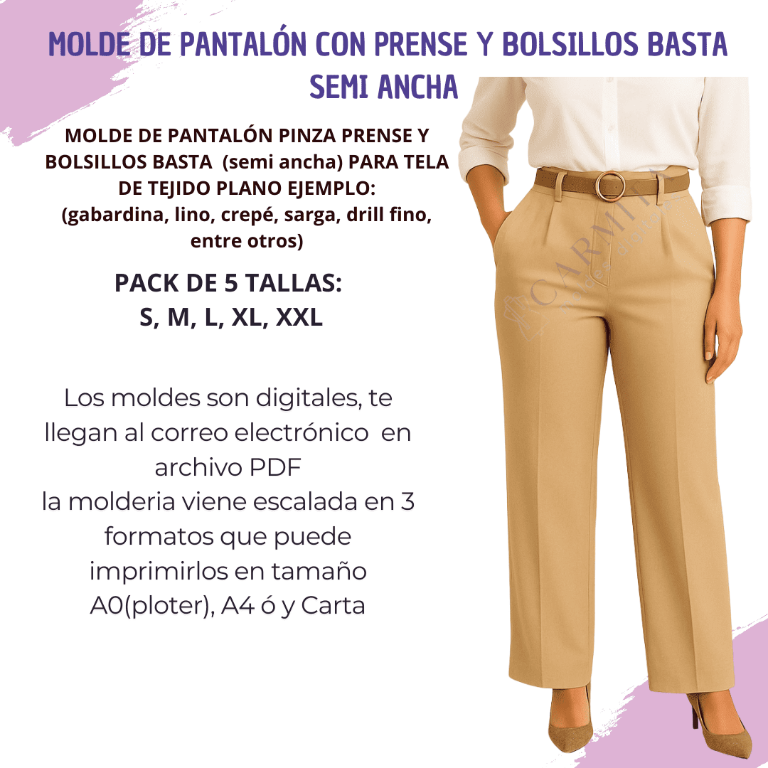MOLDE DIGITAL DE PANTALÓN CON PRENSE Y BOLSILLOS BASTA SEMI ANCHA
