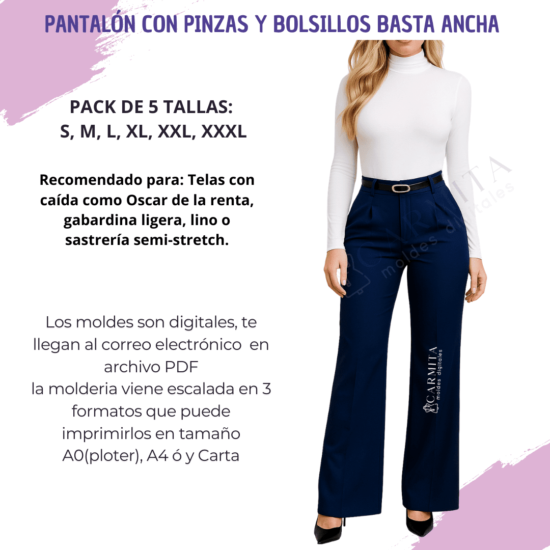 MOLDE DIGITAL PANTALÓN LARGO CON PINZAS Y BOLSILLOS BASTA ANCHA