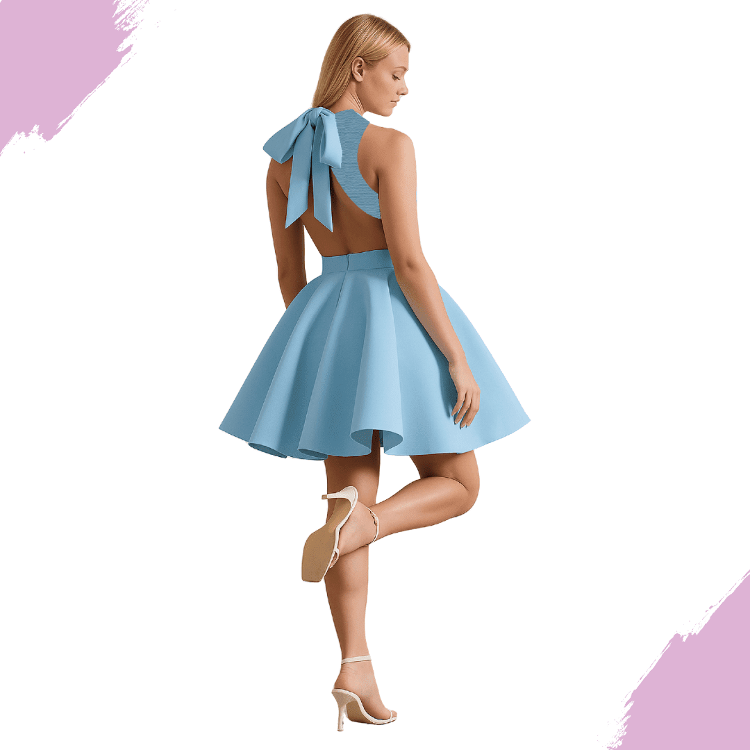 Vestido femenino con falda amplia tipo doble campana y corte en cintura. La parte superior presenta escote cerrado en el frente y espalda completamente descubierta con tiras anchas que se anudan en un moño decorativo. Su estilo es elegante, moderno y juvenil, ideal para eventos, cocteles o fiestas.